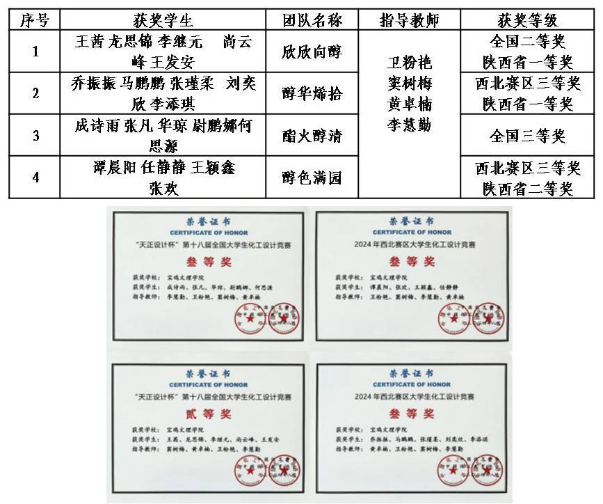 近日,2024年“天正设计杯”第十八届全国大学生化工设计竞赛全国总决赛落下帷幕。我校化学化工学院组建的四个团队分别获得全国二等奖1项、三等奖1项,西北赛区三等奖2项、陕西省一等奖2项,陕西省二等奖1项。