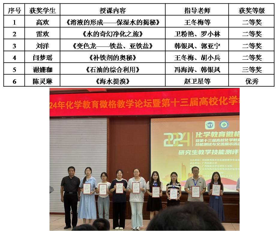 近日,化学微格教学论坛暨第十三届高校化学师范生教学技能测试与交流展示活动在广西民族大学成功举办。我院高欢、雷欢、刘洋、闫梦瑶、谢姗珈、陈灵琳等六名选手积极参与,荣获二等奖4项,三等奖1项,优秀奖1项。