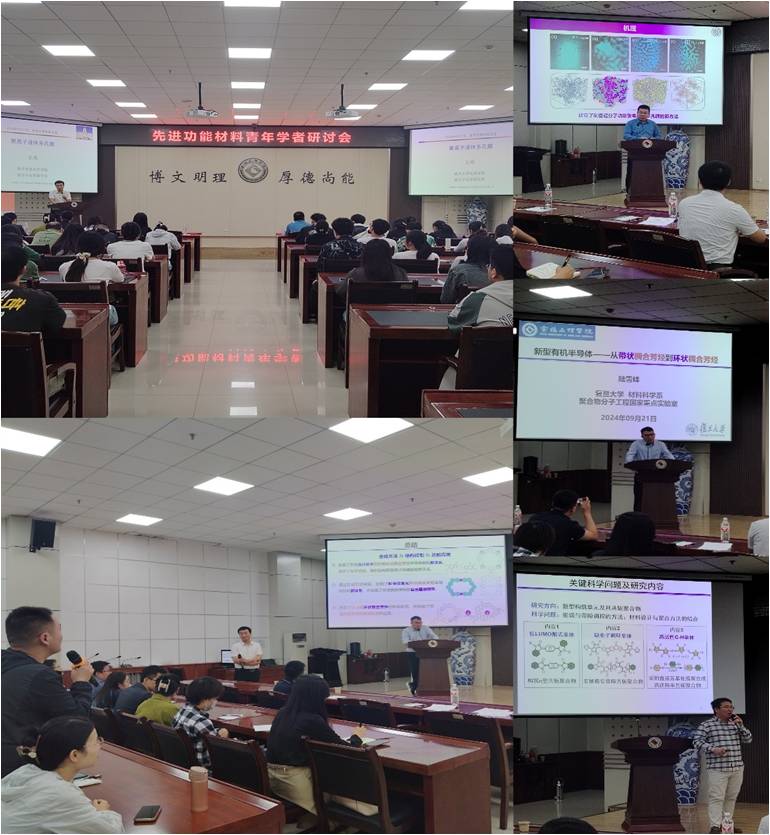 报告会上,王鸿以《聚离子液体多孔膜》为题,介绍了简易、高效制备聚离子液体多孔膜的新策略——“真空炭化”策略,指出通过利用该策略可实现高度石墨化的氮掺杂多孔碳膜的宏量制备,并为实现聚离子液体孔径和性能的调控提供了可靠的研究方法。陆雪峰以《新型有机半导体—从带状稠合芳烃到环状稠合芳烃》为题,介绍了构建新型高载流子传输性能的新稠合方法,以及新稠环体系、D–A型环状稠合芳烃半导体和强阴离子受体材料的设计理念,为环状稠合芳烃半导体材料的设计提供了新思路。邓云峰以《茚满二酮封端醌式化合物及其共轭聚合物的合成与应用》为题,介绍了基于Wittig或Wittig-Horne反应/内酯重排反应和钯催化偶联反应/空气氧化反应,构建系列茚满二酮封端醌式共轭体系的方法,以及采用C-H/C-Br和C-H/C-H直接芳基化缩聚合成高性能的共轭聚合物的策略,为n型有机/聚合物半导体材料的构筑提供了可靠方法。三位报告人现场回答了师生提出的问题,并进行了良好的互动交流和讨论。