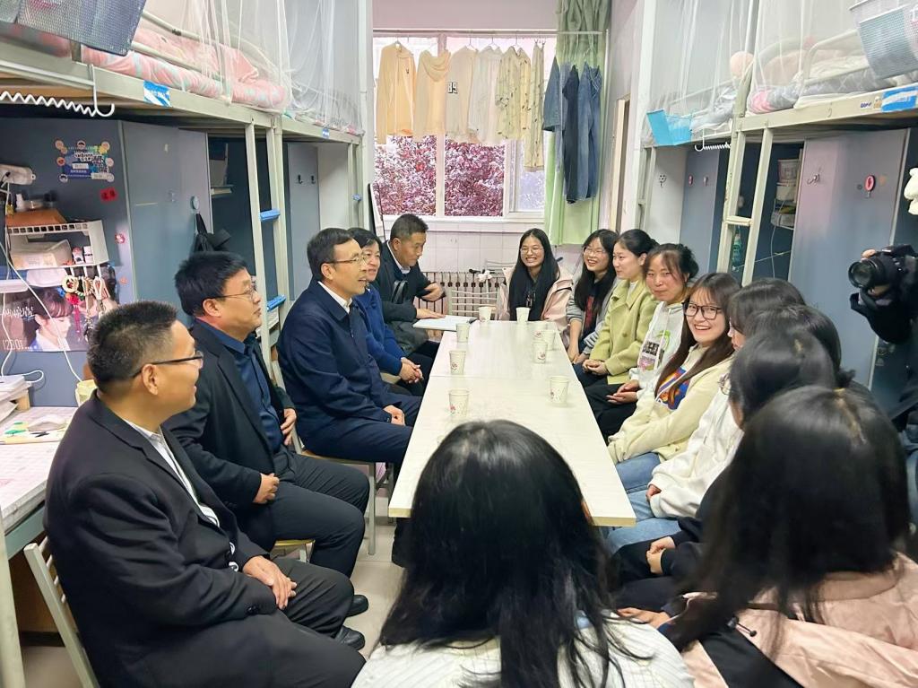 在与学生“面对面”座谈交流活动中,郭霄鹏走进联系班级学生宿舍,详细了解同学们的学习、生活情况和未来的发展规划,征求大家对学校教育教学、管理服务、后勤保障等方面的意见建议,并对大家提出的问题一一解答。在与他联系的少数民族学生交谈中,郭霄鹏亲切询问了学生进校以来的学习和生活情况,鼓励学生主动加强与各民族学生的团结和融合,体验不同民族文化和习俗,强化中华民族共同体意识。最后,他勉励同学们要树立远大志向、刻苦学习、增长才干;要相互关心、相互帮助、共同进步,努力成长为德、智、体、美、劳全面发展的社会主义建设者和接班人,积极投身到以中国式现代化全面推进中华民族伟大复兴的伟业中去。
