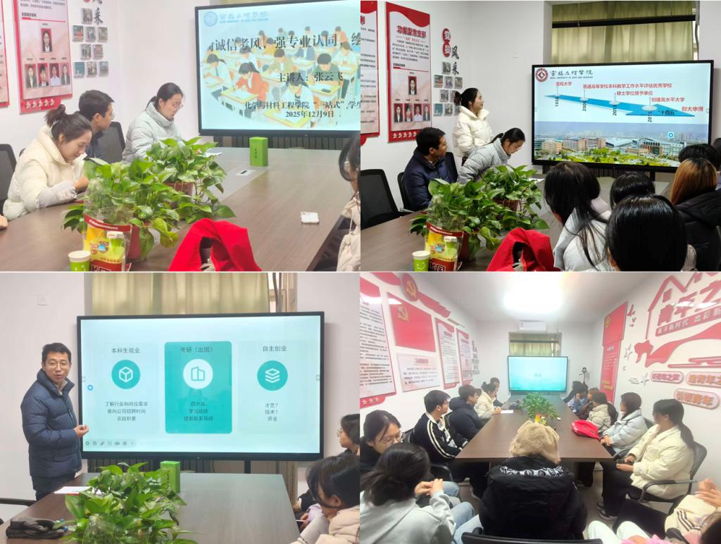 会议聚焦四六级考试诚信教育、专业认知提升和学业生涯规划三个重点。会上,辅导员带领学生深入学习考试管理规定,通过真实案例分析警示考试作弊的严重后果,引导学生树立诚信意识,严肃考风考纪。随后,学院青年教师张云飞博士详细介绍了学院发展概况、学科特色和研究生培养情况,为学生继续深造提供指导;钱华明博士结合材料化工领域发展前沿,分析了行业就业趋势和人才需求特点,帮助学生拓宽职业视野。会议最后强调,与会学生干部代表务必及时向班级同学传达会议精神,扎实做好诚信考试的宣传动员与学业规划的引导工作。