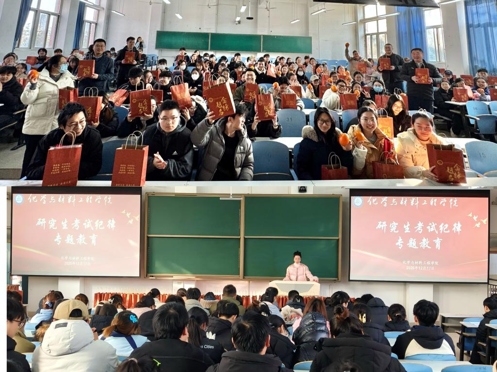 12月17日,化学与材料工程学院于高新校区思贤楼222教室组织开展研究生考试纪律专题教育暨“考研福袋”发放活动。