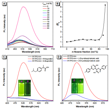 该论文报道了一对带有两个光学纯的R-或S-1-苯乙胺的手性AIE化合物R-TPE-Am和S-TPE-Am。实验结果表明,其对6对手性酸化合物和氨基酸显示出极好的手性识别效果。此外,通过在酸性条件下,手性AIE化合物与4-磺酸基杯[4]芳烃(SC4A)进行超分子组装后,得到的络合物对一些手性酸具有增强的对映选择性。通过1H NMR滴定和2D NOESY NMR光谱、SEM等研究了它们的工作机制。以上这些结果表明所制备的手性AIE化合物具有作为手性荧光受体的巨大潜力。