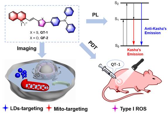 该工作设计合成了两种具有D-π-A结构的双发射聚集诱导发光分子QT-1和QF-2(AIEgens),这两种AIEgens均表现出激发波长依赖性的反卡莎性质,并能实现脂滴(蓝色)和线粒体(红色)的双色成像。此外,由于QT-1的近红外发射和丰富的ROS产生效率,QT-1被筛选为光动力治疗的光敏剂,在体外和体内均表现出优异的抗肿瘤效果。