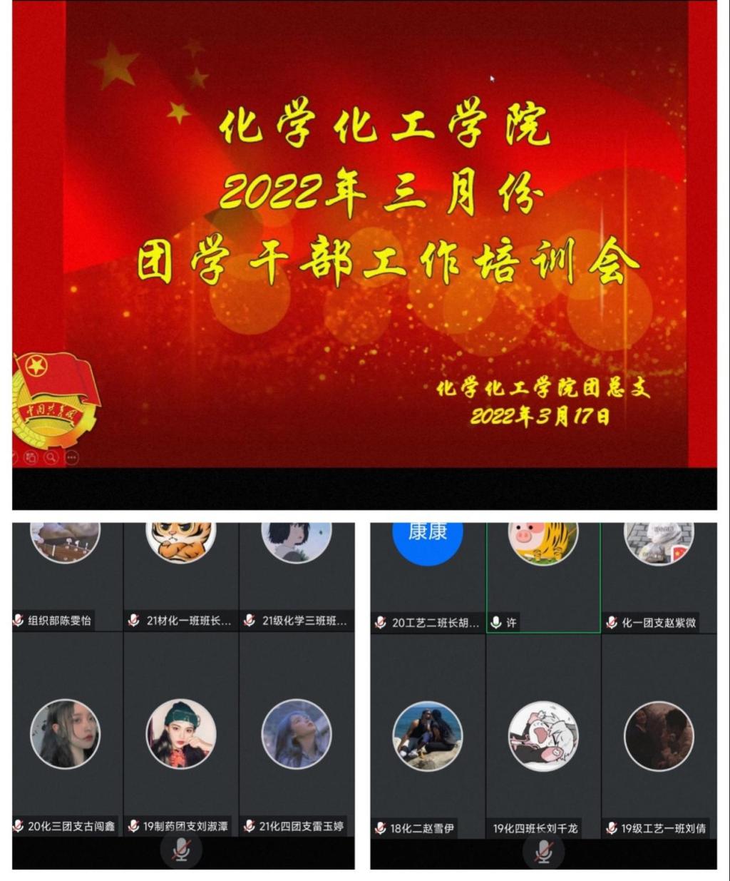 3月17日晚20:30,化学化工学院团总支通过腾讯会议,开展了3月份团学干部工作培训会。全体团学干部等共计60余人参加了此次培训会。本次培训会由团总支书记许小莉主持。
