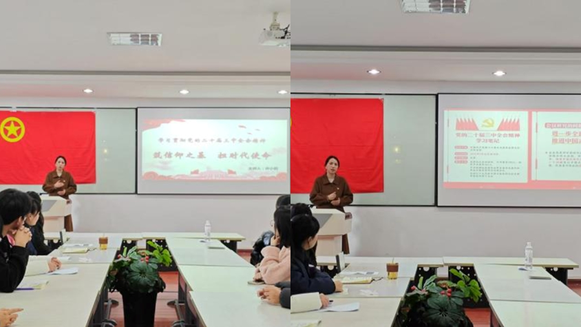 在整齐嘹亮的团歌声中,入团仪式拉下帷幕。为进一步推动我院团员青年准确领会、深刻把握党的二十届三中全会精神,入团仪式结束后,许小莉老师以《筑信仰之基 担时代使命》为主题开展党的二十届三中全会精神宣讲。她强调,党的二十届三中全会是在以中国式现代化全面推进强国建设、民族复兴伟业的关键时期举行的一次十分重要的会议,全会通过的《中共中央关于进一步全面深化改革 推进中国式现代化的决定》是新时代进一步深化改革的行动纲领与全面部署。她鞭辟入里的点明本次全会进一步深化改革的总目标是“继续完善和发展中国特色社会主义制度,推动国家治理体系和治理能力现代化”,同时指出要把握“七个聚焦”方向,贯彻“六个坚持”原则,从而逐步实现我国进一步全面深化改革的重大举措。