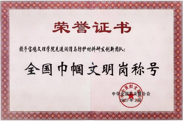 近日,我院“先进润滑与防护材料研发创新团队”凭借在科技创新领域的突出贡献和团队建设的卓越成绩,荣获“2024年度全国巾帼文明岗”国家级荣誉。