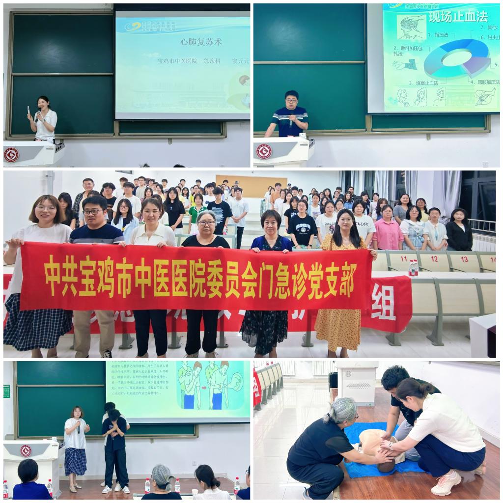 5月25日晚,我院“一站式”学生社区功能型党支部联合宝鸡市中医医院门急诊党支部,在博文楼204教室开展“关爱健康  珍爱生命” 医疗急救知识专题培训。宝鸡市中医医院急诊科副主任窦元元副主任医师、房延兵副主任医师、董永奇副主任医师及急诊科护士长白文静应邀开展培训,学院党委书记兰佳、辅导员王媛、学生代表共100余人参与活动。