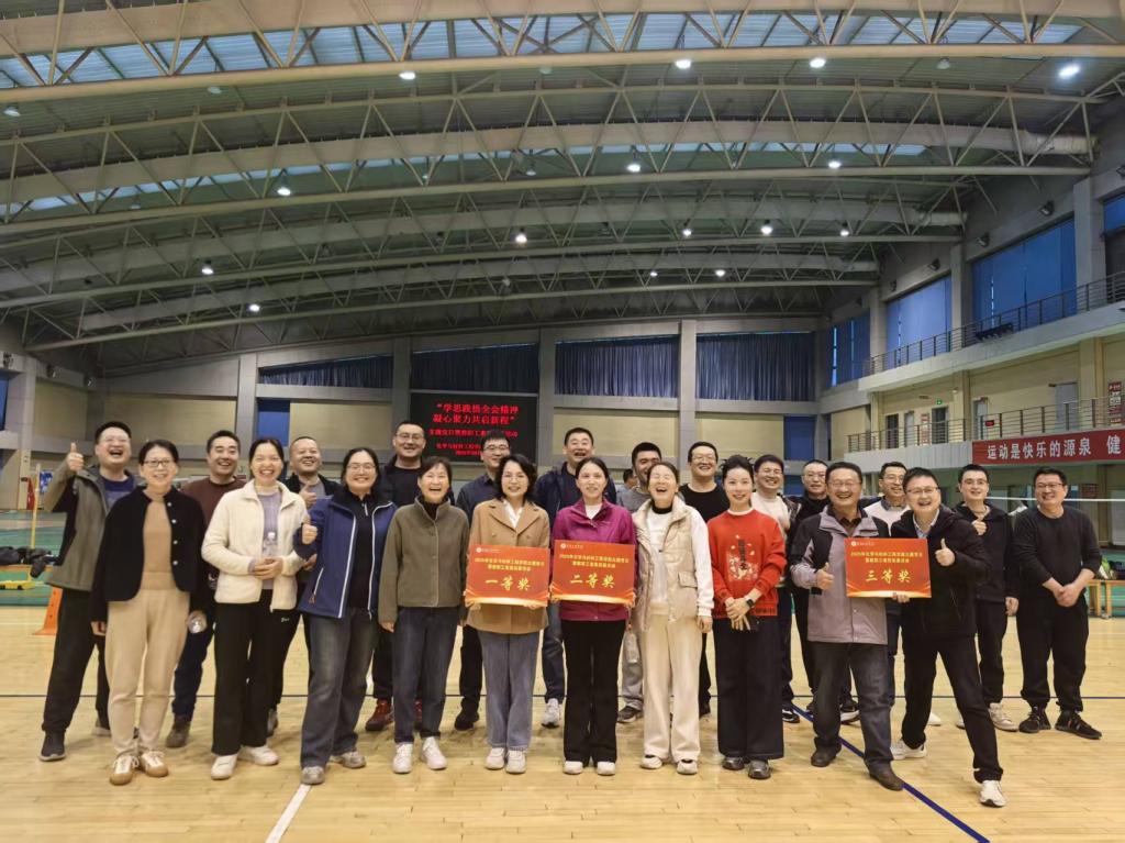 随后,在体育学院专业团队的指导下,全体教职工分为两组开展素质拓展活动。通过“合力建塔”和“回望百年党史”两项趣味性与教育性兼具的团队游戏,教职工们在协作中增进了默契,在比拼中激发了斗志。经过激烈角逐,最终评选出获奖团队,学院领导为获奖团队颁发奖牌并合影留念。