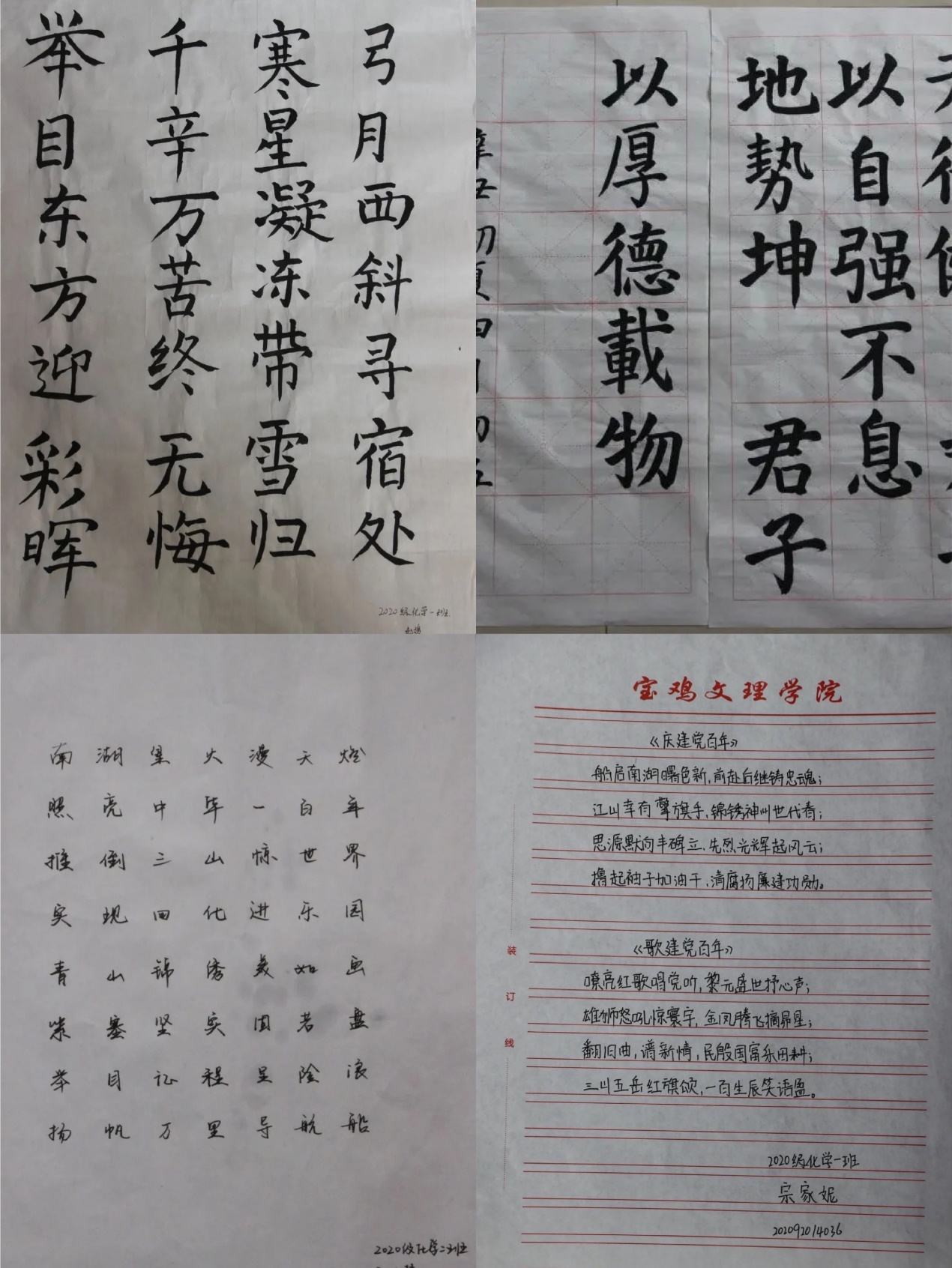 中国共产党辉煌历程让世人感叹、发展奇迹让世人惊叹、博大胸怀让世人点赞。胸怀千秋伟业,恰似百年风华。本次比赛共分为两个环节。首先,参赛选手上交参赛作品,再经过网络投票评选出获奖作品。本次比赛参赛作品由绘画、书法和原创诗歌三个部分组成,生动记载了中国共产党为人民谋幸福的初心使命,记录了中华民族谋复兴的奋斗历程,记叙了中国共产党成就伟大事业的成功密码。2018级材料化学一班陈宣奇的书法作品《天行健》,传千载文明、阅满目春色;2020级化学三班李金红的诗歌《九州蓝图庆华诞》,献亿万真心、道无限深情;2020级化学一班宗家妮的绘画作品《庆建党百年》,绘百年画卷、展神州风采。经最终评选,2020级化学二班王冰慧、2020级化学一班白牧麟、2018级化学二班李彬彬、2020级化学二班孟思琪等分别获得本次比赛一、二、三和优秀奖。
